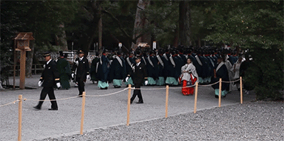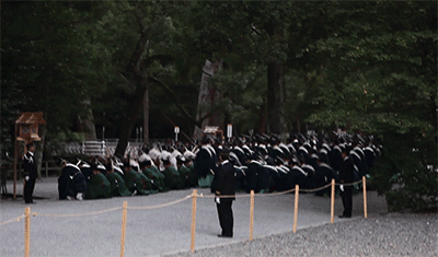 Without fanfare, the princess of Japan led a march of hundreds of Ise priests down the path that we had just walked, and they all lined up in rows next to the chests. After a ceremony with nearly 30 minutes of bowing, the chests were carried into the sanctuary and placed into the new shrine (though this was out of view).