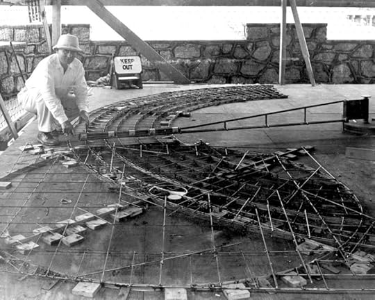 Hansen next to the completed axial precession layout before the terrazzo was laid in. (Image courtesy of US Bureau of Reclamation)