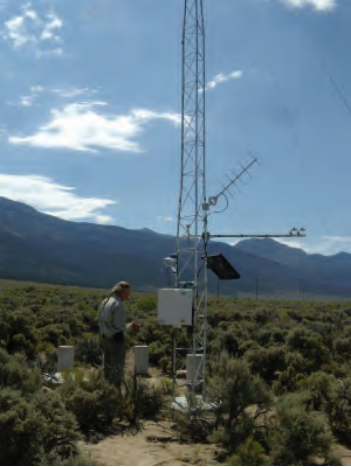 Figure 6. NevCAN weather station in Spring Valley, with David Charlet conducting vegetation plot assessments. Photo: Connie Millar