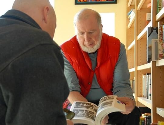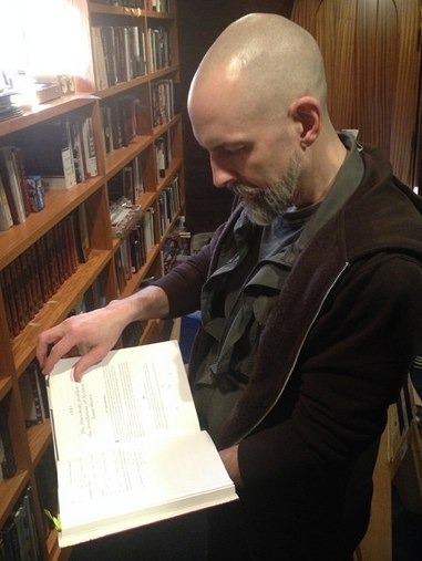 Author Neal Stephenson selecting books for the Manual For Civilization