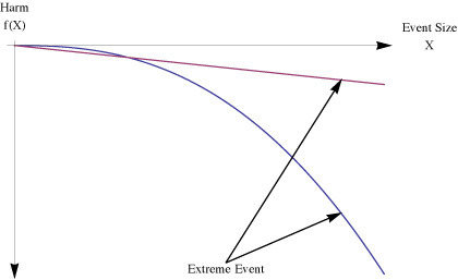 If you plot this response with harm on the vertical and event size on the horizontal, you would notice the plot curving inward, hence the “concave” shape, which in the next figure I compare to a linear response. We can already see that the fragile is harmed disproportionately more by a large event (Black Swans) than by a moderate one.