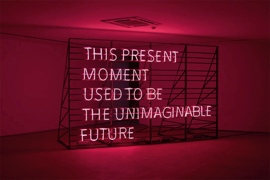 In 02019, Alicia Eggert, an artist and professor of sculpture at The University of North Texas, created a light sculpture based on Brand’s epigram titled This Present Moment. The artwork cycles through two neon statements: “This present moment used to be the unimaginable future” and “This present moment used to be the future.”