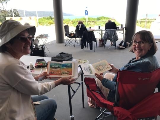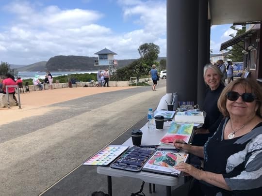 We caught up with friends who’ve recently created a magnificent and abundant exotic fruit orchard. Later we chanced upon members of the Central Coast Art Society painting en plein air at Ocean Beach on the Central Coast, another location which helped inspire my Escape to the Coast series. We spoke about creativity, and how we’re never sure exactly what will end up on the page or in the garden! Composition, light, darkness and colour all come into play.