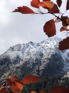 As we headed up Highway 191 toward Pinedale, a gentle rain began to fall. The Aspen trees in the groves had already lost half their golden autumn leaves and seemed barely conscious–as if they were about to drift off to sleep. Raindrops flattened in graceful ovals that streaked upward on the windshield, which was suddenly cleaner than when our trip began. Two minutes later, the sun emerged, peeking between billowy grey clouds. Off to the east, juicy, moisture-laden clouds poured down rain in sheets.