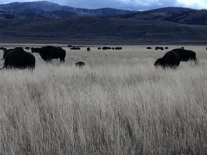 Anthony drove us around the perimeter of the park, then stopped so we could take pictures from the car of bison grazing by the side of the road. During winter, the area, known as the National Elk Refuge, is home to one of the largest herds of elk in North America that migrate down from the mountains to spend winter in the lower elevation and corresponding milder climate.