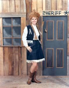 “Cartoon Corral” was hosted by Leta Powell Drake, a.k.a. Kalamity Kate. Kalamity Kate reminded me of Miss Kitty on the “Gunsmoke” television show with her fiery red hair, but without the beauty mark on her right cheek. At the base of Kalamity Kate’s bouffant and below her earlobes emerged two long braids that stretched down the front of her white ruffled blouse, nearly to her waist. I didn’t understand the concept of wigs at the time, so her hairstyle always bothered me. It didn’t seem possible to have long braids when her hair was bouff-ed on top, unless it was some variation of a mullet.