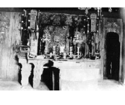Along the wall are ranged four colorful processional banners. The temple’s central altar, the Altar of Wealth, is dedicated to the gods Kuan Ti and Bok Ai. The left-hand altar is dedicated to Cling Loy Goon, Toy Sing Goon and Uah Poe, all gods of good health, and the right-hand altar to Kuan Yin and Leong Mar, goddesses who protect women and children.
