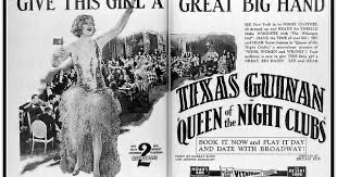 Having seen her perform at the Beaux Arts, New York show producer Nils Granlund introduced Texas to Larry Fay, a notorious rumrunner. She became the hostess and mistress of ceremonies at Fay’s El Fey club, one of the famed illegal speakeasies in New York. The club, on 46th Street near Broadway, opened from midnight to 5 a.m. It stood at the top of stairs leading to a door with a peephole. Inside, the silk-walled club seated about 80, with a small stage for chorus girls.