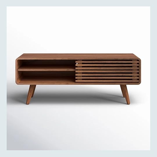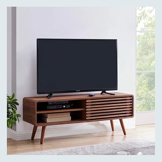 Because of that, I rounded out some other picks in different colors. The black entertainment center from Living Spaces is such a great price, but it’s not clear to me what the size really is. It says 74 inches, but is that the media stand itself not including the bookshelves, or is that total? It may be too diminutive if that’s total, tbh. The black is a nice departure from all the oak in the room, but the silhouette is still classic enough to make sense. That Bankhead TV Stand isn’t 100% in line with my taste (mostly just that arch at the very bottom rail), but the color is nice, the size is right and it provides plenty of storage. I like the warm, deep tone of the Bowie Media Console for some variation but it’s about three times the original price of what Katie said she was looking to spend. The Scarlett is very cute and well-priced but I wonder about quality in the long run.