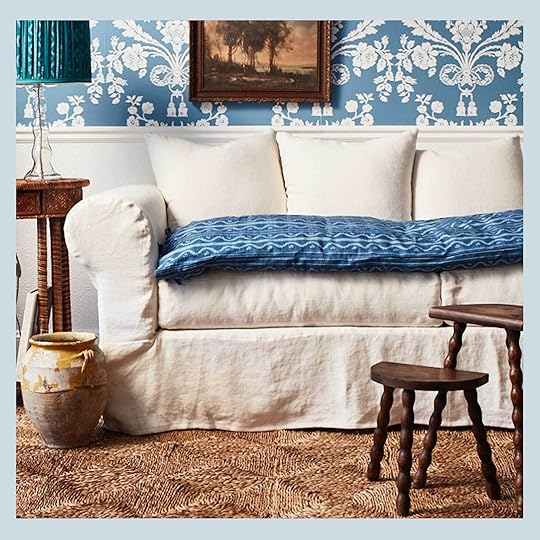 The two photos above are from Flea Market Fab, and both show a thicker coverlet and mudcloth fabric effortlessly covering both indoor and outdoor sofas. I think in the context of those room designs, it works beautifully, though given the right print and colorway on the blanket, it might also be a cool moment of tension in a more modern space.