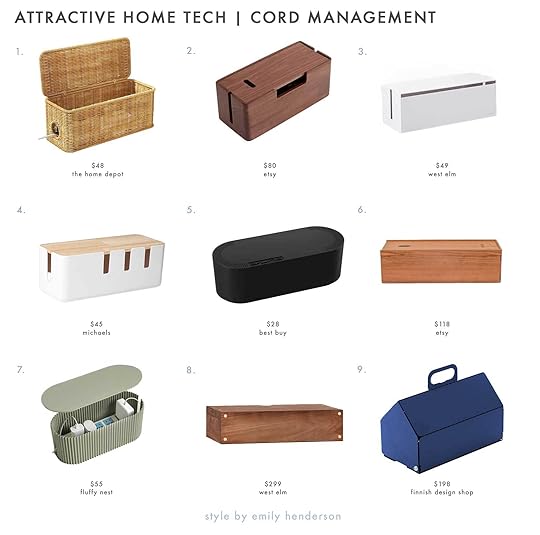 Cute Cord Management BoxesAnd finally, some cord and cable org. While I’ll never see the need to guinea rig a stack of books or a rattan basket to cover a modem or cable box, I do sign off on these types of boxes to house power strips and excess cords because those can quickly become a tangle of spaghetti and collect so much dust. In the past, I’ve had plastic ones like the Yamazaki one at #3, but there are even beautiful wood versions like this walnut box from Etsy (#2) or this cherry one (#6), also from Etsy. For the maximalist, this cobalt blue little house from Finnish Design Shop is so much fun. West Elm even sells this very beautiful appliance cord box for things like your coffee or tea stations (though warning: it’s pricey).