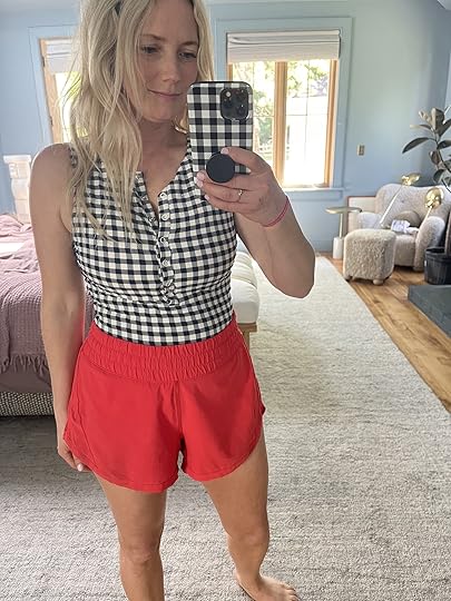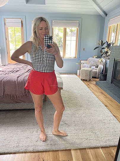 This Nike pullover top is what I throw on when I want to have a slight layer (that is very flattering). The shoulders have a lot of structure and the wide zippy neck and color-blocking plays with your eye (in a good way). My “Covid 7LB” is going nowhere (which is ok, these squishimama love pillows are full and happy:)) so I have been really noticing what I feel good in and this is really flattering. The Vuori shorts are nice because they have a really wide band (so they don’t cut in and they are very high-waisted). I wish these had pockets:)
