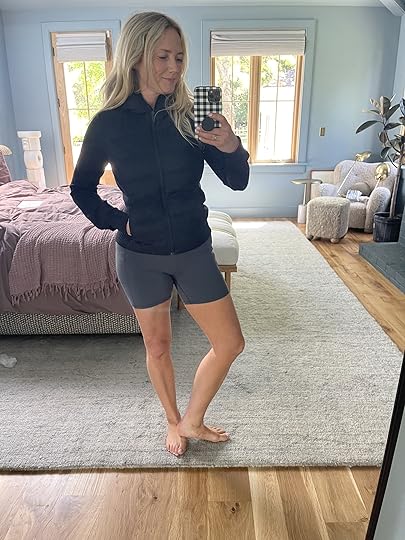 I have bought this running jacket in another color, but I still prefer this super dark purple (this is 5 years old at least). It’s slimming, warm around the torso, but lightweight on the arms (almost like a vest with sleeves). The shorts are Vuori and I like them, but honestly, my hips jut out more than I want them to in these because of the pockets, so I’m still in the market for some that are more flattering (my dogs ate the crotch out of my favorite printed shorts).