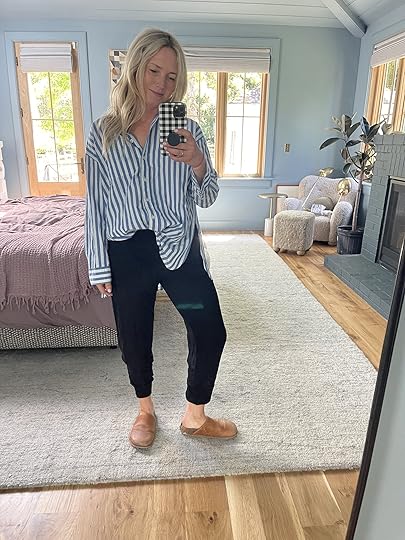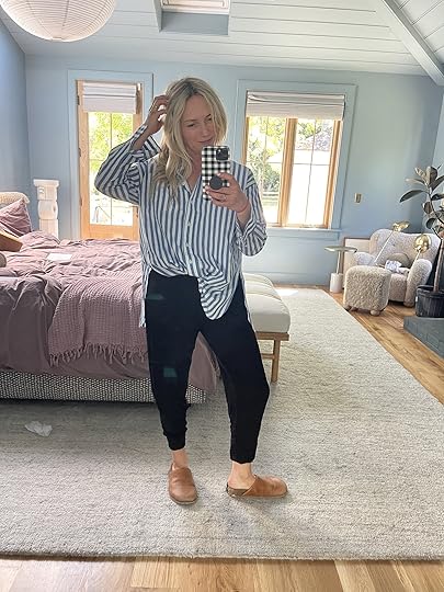 This is a newer Madewell shirt that I love so much I tried to order in the bright blue linen but it sold out too fast. It’s poplin but has a great wrinkle to it and if I grab it out of the dryer quickly I don’t have to do anything to it (historically poplin can be too high maintenance for me). The pants are pajama joggers from Gap (love) part of their Tencel collection that is trademarked, and whatever they do to this fabric is magic. It’s just so soft. I wear exclusively these pajamas (well one set of Target) and I have 3 sets of them. Anyway, these joggers are SO SOFT and I think you can wear them out if you need to (this is my solo dinner outfit).