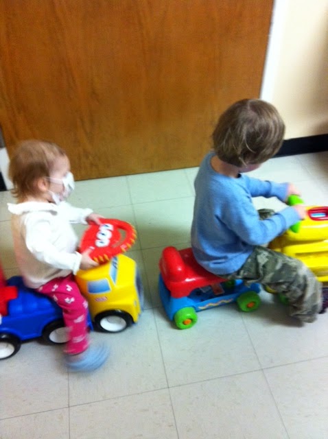 The day started out at 7:30am-- labs, then clinic with the transplant coordinator and the pulmonologist, and then physical therapy with Rebecca. Her pulmonologist shook his head and watched as Wrenn jumped on the table. We all discussed where we were one year ago--facing issue after issue for 3 months straight. They are cancelling her physical therapy sessions because she is all caught up. We all knew at that moment how lucky we were to see her so healthy and thriving. She is one of the lucky ones. After a quick lunch we were off to the Ambulatory Procedure Center for an x-ray and then Wrenn was sedated her for her Bronch, High Resoluation Chest CT & CXR, Ventiliation Perfusion Scan, Echo and Infant Pulmonary Function tests. While she was under they stuck her in four places to find a good vein for an IV. She did great with the sedation and by 6:30pm was resting at home. Tanner spent the entire day at the Sibling Daycare Room so we could focus on Wrenn's busy day.