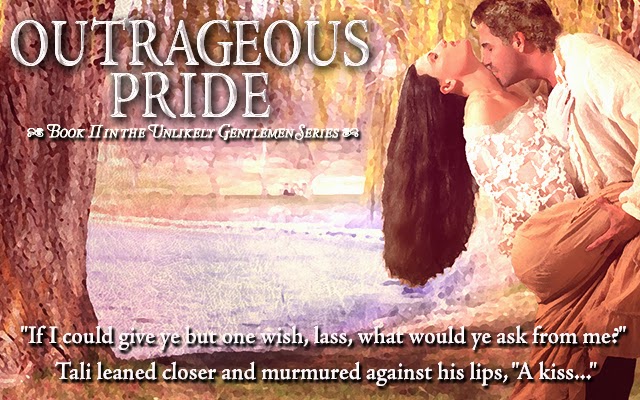 Those two elements serve well in writing sexual tension and gender conflicts leading to the first moment of bliss when the hero and heroine discover mutual attraction. This is my “first kiss” between Kellan Lonigan, my hero, and Natalia Fitzwilliam, my heroine, in Book II of my Unlikely Gentlemen series, Outrageous Pride.