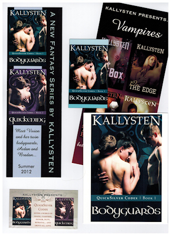 I’m pleased to welcome back author Kallysten to the blog today. She’s going to share a bit of her brand new book, Bodyguards with us and is offering up a few book swag packs as well.