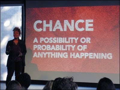 Jessica Disu, who describes herself as a Humanitarian Rap Artist and goes by FM Supreme, spoke at the 35th gathering of the Chicago chapter of CreativeMornings. Disu’s speech focused on “Chance”—CreativeMornings’ global theme for November 2014 and a crucial element driving her work. Her path included this trajectory: floating in darkness, seeing the light, seizing it, and spreading it. Disu—who she was, who she became—served metaphorically as a mirror, reflecting the human struggle to not liv...