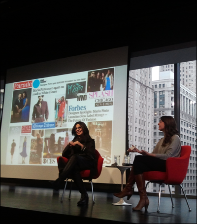 Fashion Designer Maria Pinto (left) spoke at the first 2015 gathering of the Chicago chapter of the CreativeMornings community on January 23. She was interviewed, on stage, by CreativeMornings/Chicago Host Kim Knoll of Knoed Creative.(1)