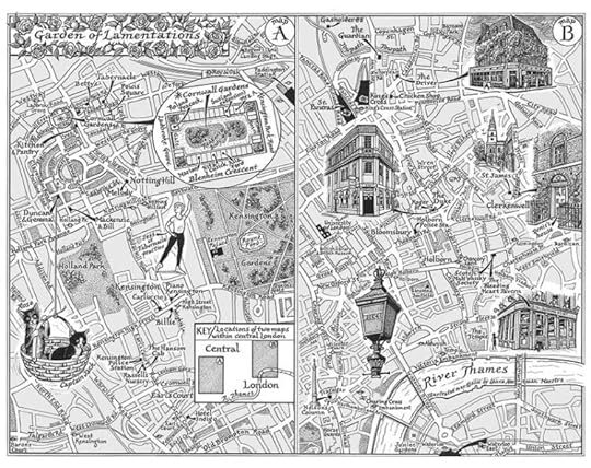 When I opened the front cover to read the flap, my eyes fell upon a map, intricately drawn onto the front cover end paper. The back cover end paper contained the same map. Wow! The map details captured my imagination. I’d been to London several times in my career and loved the history, diversity of place, and density of experiences from the roof top gardens in Kensington to the changing of the guards at Buckingham Palace.