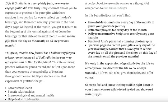 Pick it up here: Gifts and Gratitudes: A Year of One Thousand Gifts