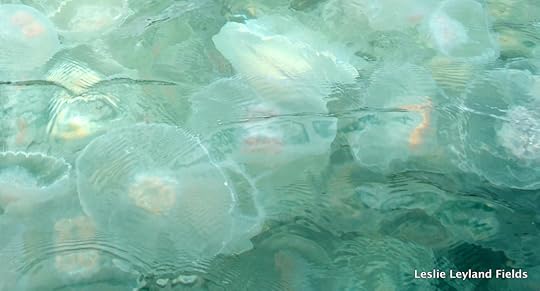 I look around me. Not many fish likely tonight, but it’s a jellyfish night, or rather, a jellyfish week. The ocean is thick and mucus-y with them, these Aurelia aurita, moon jellyfish, the clear kind that look like ocean water plus Knox Gelatin, with a little hyphenated cross as its entrails.