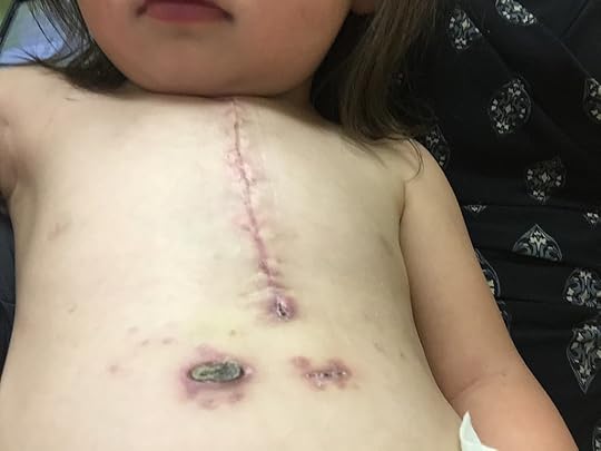 “Mama? Mama?” She pats my arm. And when I look up, she takes her hand, and pulls up her shirt, and runs her fingers up and down the raised purpling scar that splits her chest.