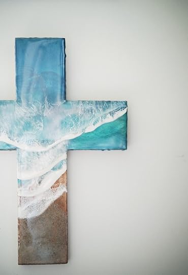 And when I lead the tip of my finger across the broken shards of glass painstakingly placed across my canvas, I can feel this kind mercy written in clear glass, a word hiding right where I’ve laid out the bits of glass to create a frothy white edge of waves meeting the sandy shore.