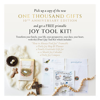 And pick up a copy of the new 10th anniversary edition of One Thousand Gifts, and count all the ways He loves you, & fall in love with Him all over again! AND, when you do, you get an entire FREE Joy Tool Kit which includes 5 exclusive printables: a “How to Always Find Joy” Frameable, a Daily Joy Map & Planner, a Family Gratitude Gift Jar kit, a 12-Month Joy Calendar, and a Daily Joy Compass. Click here to learn how you can get yours today!