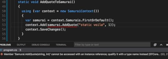 Additionally, beause I want to control how develoeprs interact with my API, there is no DbSet for Quotes. You have to do all of your queries and u pdates via context.Samurais.