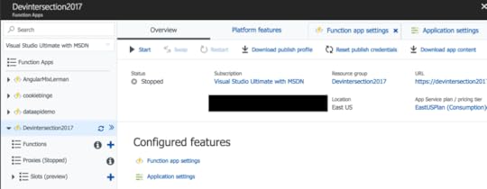 The Overview blade of an Azure function app has a “download app content” option. That will pull down all of the relevant files onto your machine. So next, I go to the overview of the DevIntersection2017 function app and click on the download app content link.