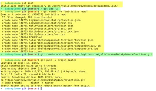 Back in the portal, I select the new function app again, then from it’s Platform Features page, open the Deployment Options. Choose Setup new deployment and follow the steps to connect the function app to your repository. When you’ve completed the setup, you can use the Sync button to force the deployment to happen. All of the files are now in my new dataapidemo function, including the function.json files that contain the function setting (e.g. integrations etc) and any other files I may have added to my functions.