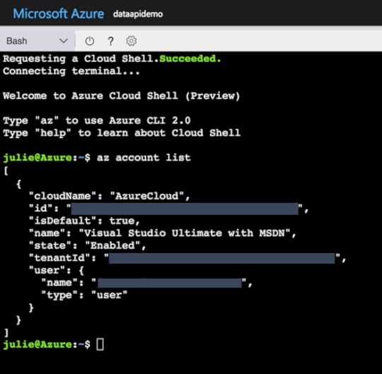 The parameter shortcuts for name and resource-group are -n and -g. Mine are both the same name: dataapidemo. Here’s what the command looks like (except for the wrapping that my blog is forcing):
