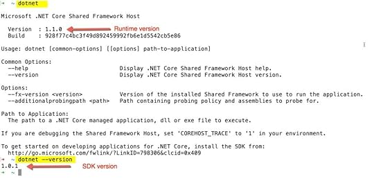 After it’s installed, typing dotnet will show you that you have the 1.1.0 version of .NET Core. dotnet –version gives you the version of the SDK. That should now be 1.0.0-preview2-1-001377,
