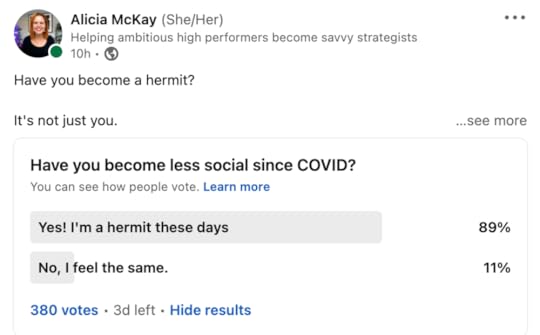 Maybe, instead, you breathed a deep sigh of relief when I said we're still into staying home. If you're anything like 89% of the people I asked this question to on LinkedIn yesterday afternoon, you might be feeling like a bit of a hermit. Check out these results after just a few hours!