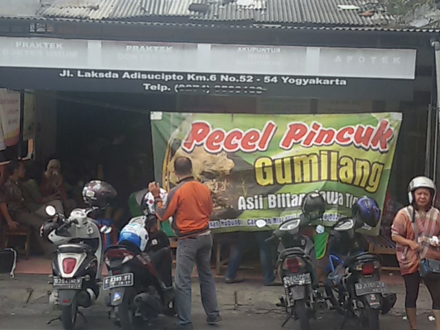 Pagi itu saya menapaki Jalan Laksda Adisucipto KM6,5, Yogyakarta, dengan perut lapar belum sarapan. Tujuan saya Eastparc Hotel sudah di depan mata. Tapi sebuah kedai pecel dengan sejumlah motor dan mobil yang parkir di depannya membuat arah langkah saya berubah.