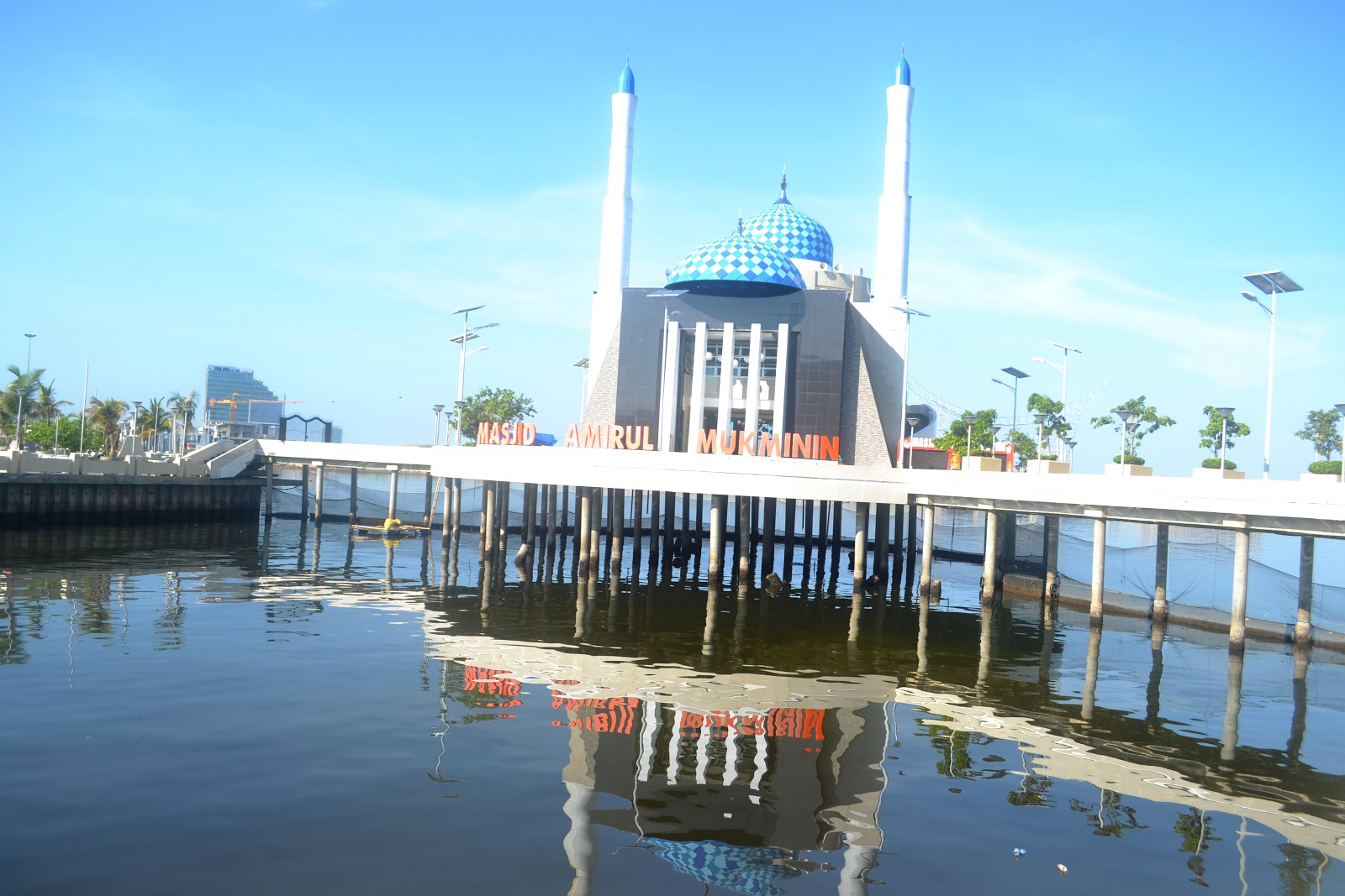 Padahal saya masuk ke area Pantai Losari masih pukul delapan, namun matahari sudah menengat kulit. Tujuan pertama saya adalah melihat-lihat masjid terapung Amirul Mukminin yang tampak anggun berdiri di atas tiang setinggi sembilan meter.
