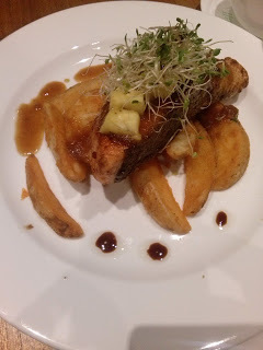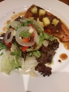 Yang bikin hidangan salmon ini menjadi segar adalah topping kecambah yang segar dan irisan nanas yang bercampur di saus. Oh iya, itu kecambah apa ya namanya? Rasanya mirip-mirip selada air.