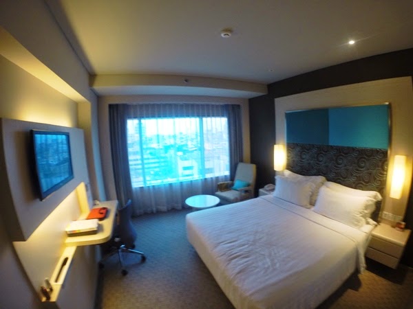 Saya suka interior kamar yang modern, tapi kurang suka dengan pemandangan ke luar jendelanya. Eh, ketika senja dan fajar, ternyata lumayan indah juga pemandangannya. Indah buat difoto pemandangan langitnya.
