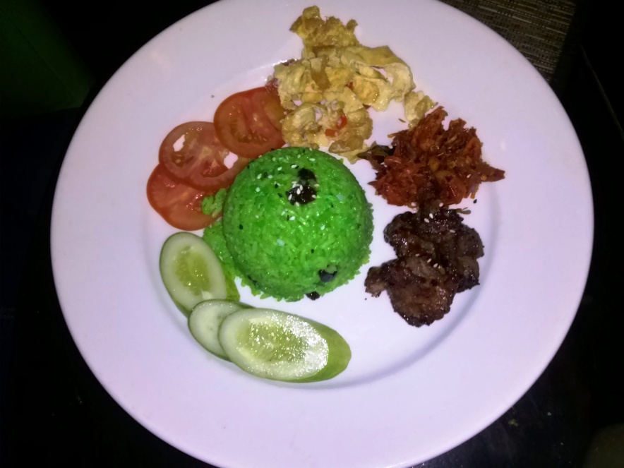 Nasi ijo royo-royo ala Roemah KeboenNasi ijo royo-royo dilengkapi potongan timun dan tomat segar. Nasinya seperti nasi goreng tapi lebih lembut. Yang menjadi pertanyaan adalah warna hijaunya itu. Soalnya secanggih-canggihnya teknologi pangan, saya belum pernah dengar ada beras warna hijau. Jadi kemungkinan besar warnanya memakai pewarna makanan.