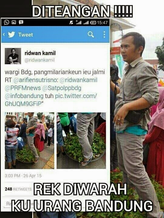 Walikota Bandung Ridwan Kamil geram melihat ulah warga yang merusak lingkungan di jalan Asia Afrika Bandung. Alih-alih menjaga, mereka malah menginjak pot kembang, berdiri di atas bangku, dan mencopot aksen nama negara.