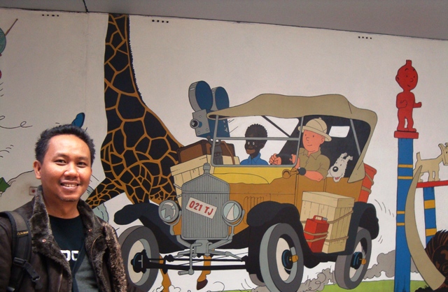 Saya sendiri tidak sengaja melihat mural bergambar karakter Tintin dan kawan-kawan karena memang kebetulan saat sedang jalan-jalan di Brussel harus turun di stasiun kereta bawah tanah Stockel.