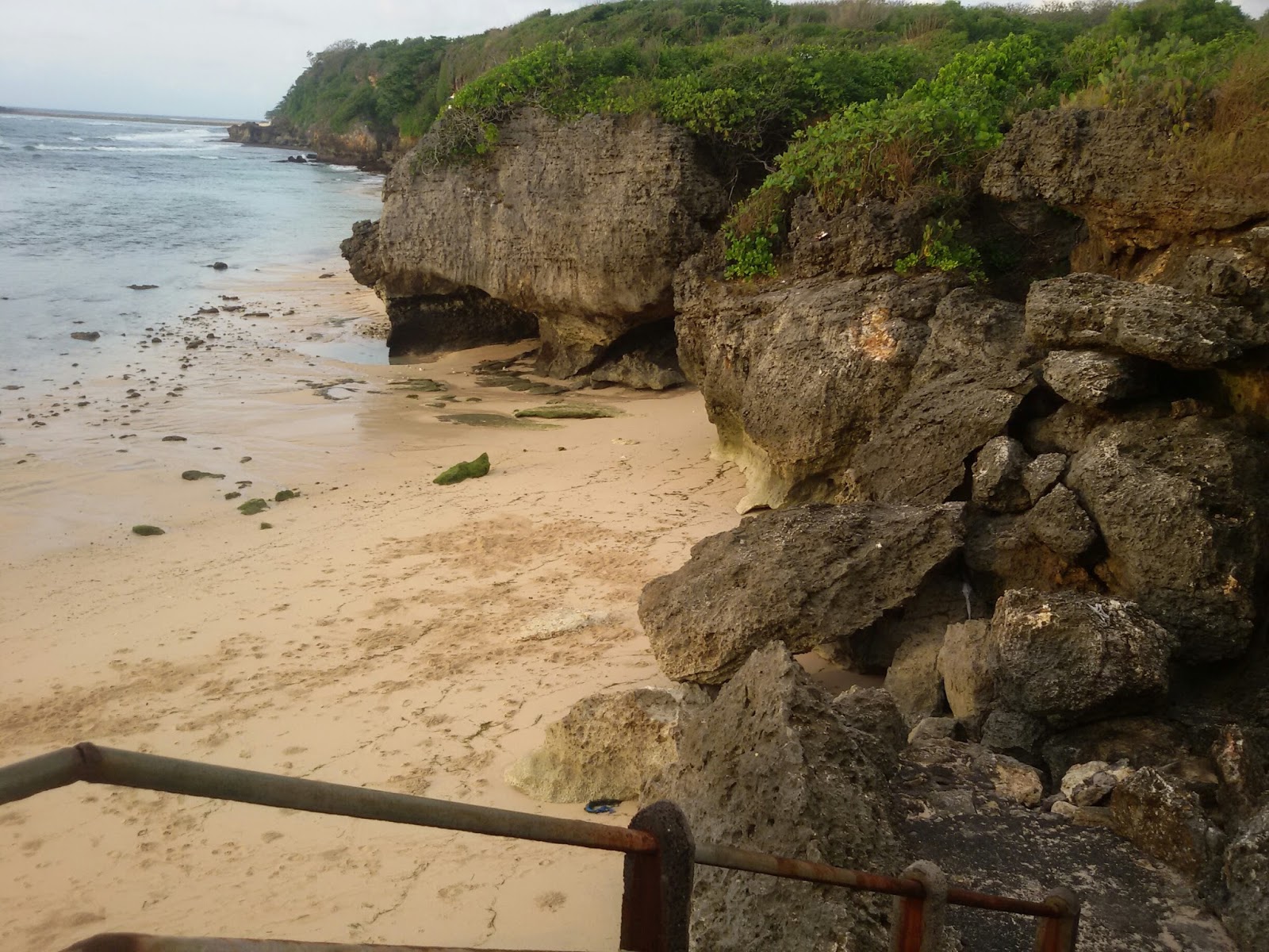 Setelah melewati jalan dengan kanan kiri semak-semak, akhirnya saya menemukan jalan beraspal dengan papan penunjuk ke Pantai Geger. saya terus terang baru mendengarnya. Ketimbang penasaran saya pun mengikuti jalan itu yang ternyata membuat saya sampai ke hamparan pasir pantai nan indah.