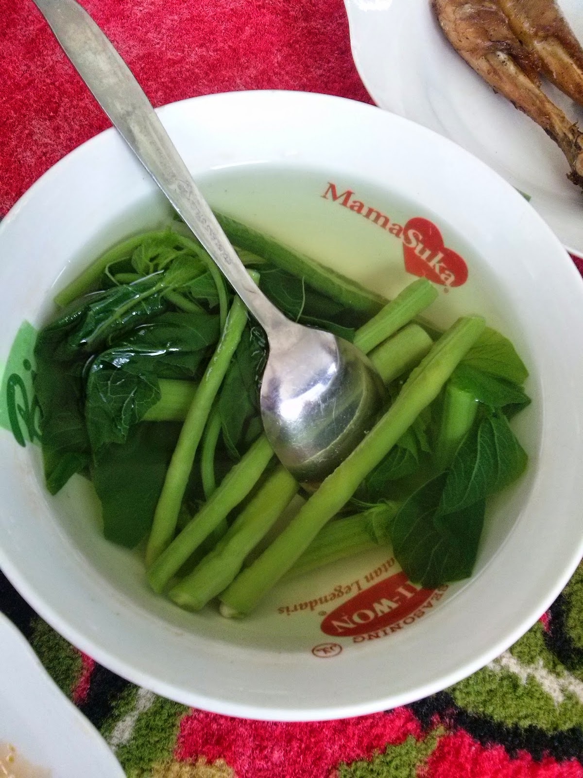 Cara penyajiannya unik karena bebeda dengan penyajian ayam taliwang. Ayam rarang disajikan dengan kacang kedelai goreng, sayur bening, ati empela goreng yang ditusuk seperti sate. Kalau ada yang tidak suka boleh disingkirkan kok. Saya sih suka dengan sayur beningnya karena hitung-hitung pengganti lalab sebagai makanan wajib saya.