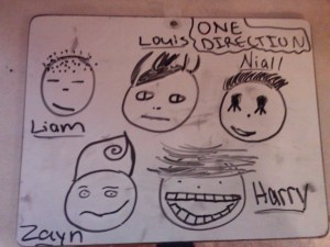 The boys of ONE DIRECTION have inimitable appeal for teeny boppers the world over. They each have a very particular style. Please notice my 11-year-old daughter’s eraser-board rendering above of the ONE DIRECTION characters. (I think it’s brilliant.) She’s tapped in to how each of them has little quirks that make them unique. Yet, what everyone loves is how they sound so seamless together. It reminds me to keep my characters like that. Imperious villains and reluctant heroines are predictable. One might say boring. Give them quirks and catchphrases, accents or tics. And a swoopy cute haircut doesn’t hurt either.