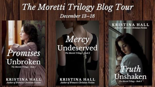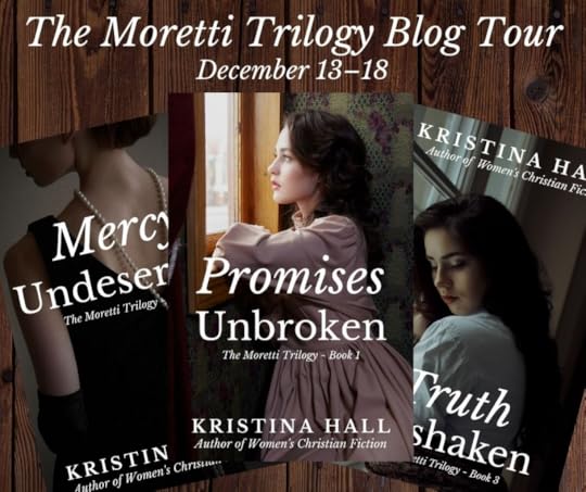 The giveaway runs from 12:00 am on December 13th to 12:00 am on December 19th, and Kristina is giving away the entire Moretti Trilogy (Promises Unbroken, Mercy Undeserved, and Truth Unshaken) in the file type of the winner’s choice (PDF, mobi, or epub). The winner will be announced on December 19th (Sunday) in her blog tour wrap-up post, and she’ll contact this individual by email to find out what file type to send. The entire set of books will be sent by email.