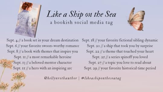 ~ the rules ~ There are prompts for every other weekday in September, but you’re welcome to share whenever you can and catch up at any time. Feel free to use any social media, including Instagram, Facebook, Twitter, your blog, and YouTube. Share about books that fit into the categories, and have fun! Don’t forget to use the hashtag #likeashipontheseatag and tag @kellynrothauthor!~ the prompts ~