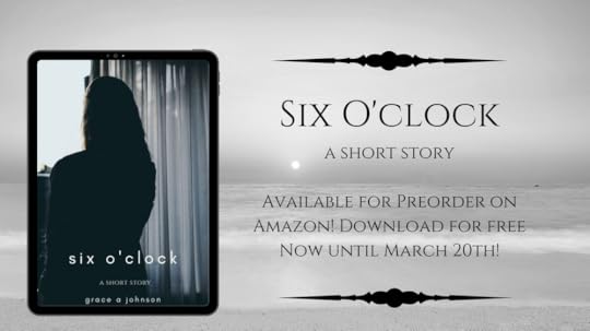 Next order of business, I will remind you that Six O'clock--my new short story--release March 20th, so you only have eight more days to preorder a copy or download one for free here! Don't forget to share this graphic on social media!!