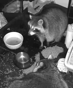 Fat-Ass has won. He (she?)showed up again last night–Emily hasn’t for three days, I’m worried–and somehow managed to climb over piles of books and papers to reach the bag of cat food, toppling it and him onto the floor, after which he shrieked with rage and left, never to return. So far. It was the first time I’d laughed in weeks or at least it felt like it. And now I’m kind of hoping he comes back tonight. He went to all that trouble to spill a pound of cat food on my workroom floor, he should at least reap some kind of reward. Also, since Emily has evidently been adopted by someone else–I refuse to believe anything horrible–Fat-Ass may be my new pet. I have to admit an affection for his little bandit face as it peers up at the red lights of the camera, probably wondering “What is that thing?” and “Can I eat it?”