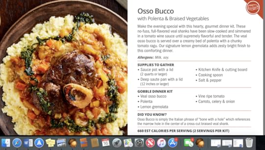 But trying all those different meal services did remind me that I love food. Not just eating it, which has been vastly diminished by the no-appetite-low-grade-nausea stuff, but looking at it, choosing it, working with it, cooking it. I’d forgotten that one of the reasons I’d been such a good cook way back when was that it was so wonderful to do. One of the reasons I stuck with Sunbasket as long as I did was that their ingredients were so superb and packaged so well that I just wanted to pat everything as it came out of the box, the way I’d chortled over great ingredients way back when (also their jambalaya was really delicious and they were the service that introduced me to sambal oelek, which is phenomenal stuff). One of the reasons I dumped one of the other services was that they sent me a package of Marzetti Salad Dressing. (That was one of the Are You Kidding Me moments, surpassed only by the first delivery from Freshly which was packaged pre-cooked meals in little Lean Cuisine plastic trays.) I will admit that one of the best meals I got from Gobble was their Osso Buco for which they’d already prepared the meat–if you sign up for that, DEFINITELY get the Osso Buco–but otherwise I like the services that give you all the ingredients, raw and beautiful, and then say, “Cook this.”